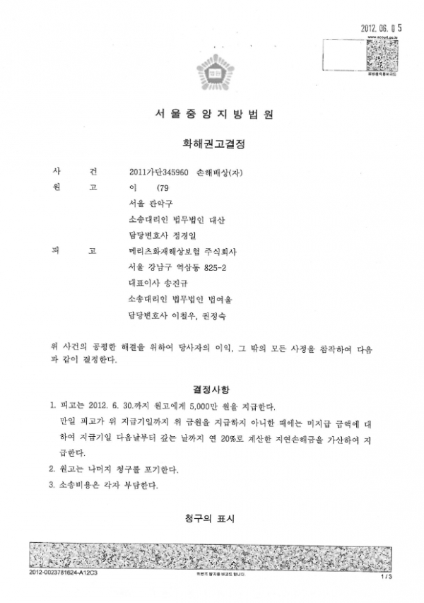 서울중앙지방법원 2011가단 345960호 화해권고결정문
