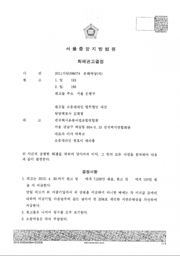 서울중앙지방법원 2011가단396074호 화해권고결정문