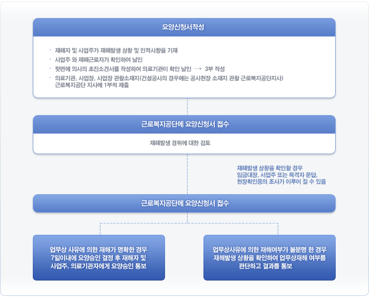 청업무상의 사유에 의하여 부상을 당하거나 질병에 걸려 4일 이상 요양이 필요한 경우에는 요양신청서를 제출하여 업무상 재해로 승인을 받아야 합니다.