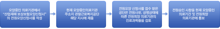 ㆍ처음부터 상병상태에 적합한 지정의료기관에서 요양을 시작한 경우에는 특별한 사유가 있는 경우에는 전원할 수 있는데 근로복지공단 해당지사와 사전 협의 후 승인을 받은 후 전원하셔야 합니다.